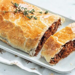 Luxe kalfsgehaktbrood met pistache en in wijn gemarineerde pruimen, appel, abrikozen in bladerdeeg. Alleen in de oven verwarmen. Een feestelijk, exclusief en gemakkelijk kerstgerecht. Voldoende voor 4 tot 6 personen (1,2 kg p/st)